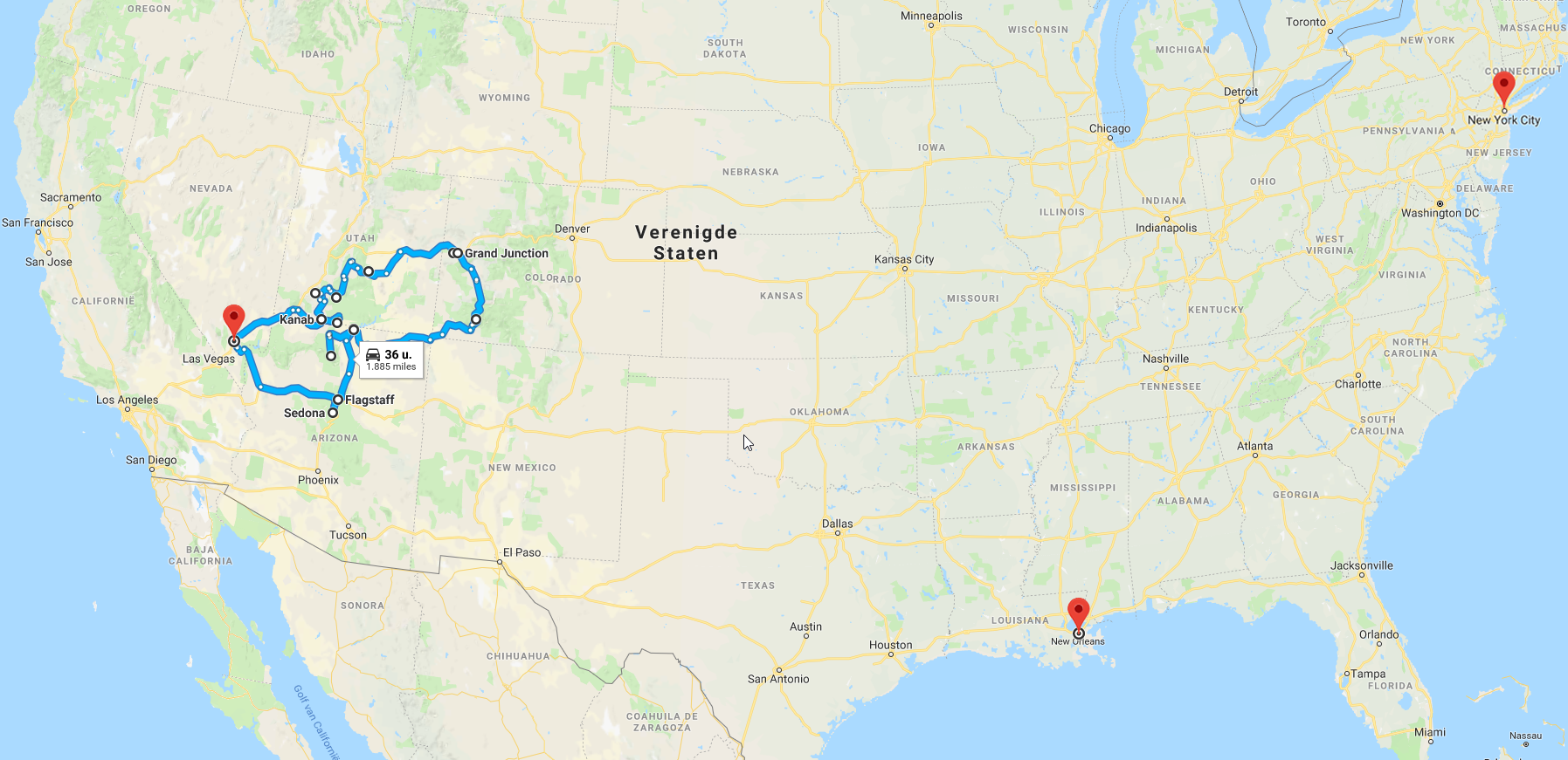 Het was ook eens wat anders dan de veertien-uur-durende vluchten, want na een dikke acht uur was het al “touch down in the land of opportunities” – helemaal klaar voor een trip van drie weken door de VS. Om jullie een idee te geven van onze route, hebben we geprobeerd om een overzicht te maken van waar we geweest zijn en welke road trip we gemaakt hebben. Hierbij plaatsen we een aantal foto’s die een goed beeld geven van de verschillende gebieden. We hadden graag alle foto’s laten zien, maar de 1126 foto’s die we gemaakt hebben, zouden in één keer al onze opslagruimte opslorpen. Weet echter wel dat alle foto’s die je in de VS maakt (en zeker in de natuurparken) mooi zijn, maar nooit eer doen aan de werkelijkheid.